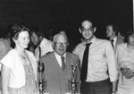 Hughes trophy winner Catherine Desrosiers and Hebert Trophy winner Paul Saltzman with Cougar extraordinaire Joe Taylor at the Clark University Athletic Awards Banquet, 1982.