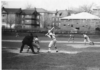 Clark University baseball players in the middle of a game, circa 1960s.