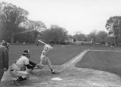 Clark University baseball player in the middle of an at-bat [5], circa 1950s-1960s.