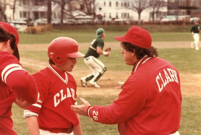 The Clark University baseball coach talks to one of the players during a game, 1988.