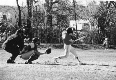 A Clark University baseball player in the middle of an at-bat, date unknown.