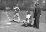 A Clark University baseball player in the middle of an at-bat, circa 1950s-1960s.