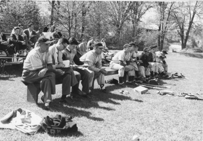 Clark University baseball players on the team’s bench, circa 1950s-1960s.