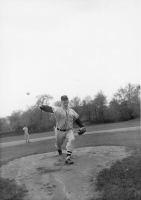 A pitcher (Byron Law) from the Clark University baseball team throws the ball, circa 1962.