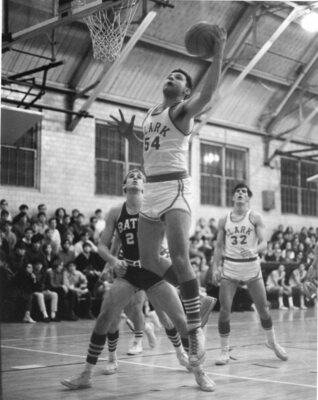 An action photograph of the Clark University men's basketball team during a game, circa 1960s.