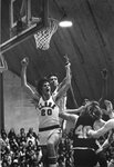 An action photograph of the Clark University men's basketball team during a game, circa 1980s.