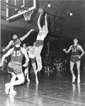 An action photograph of the Clark University men's basketball team during a game,1955.