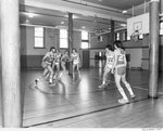 Photograph of members of Clark University's men's basketball team practicing, circa 1970s.