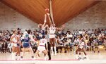 Action photograph of a Clark University's men's basketball game tip-off, circa 1980s.