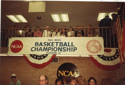 Photograph of a banner that says "NCAA Men's Basketball Championship Division III". Clark University's men's basketball team were the national runners-up that season.
