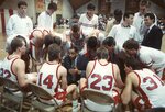 Photograph of Coach Kevin Clark strategizes with Clark University's men's basketball team during a game, 1988.