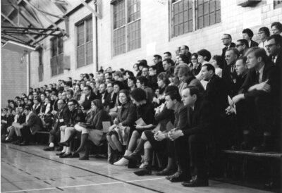 Photograph of attendees at a Clark University men's basketball game sitting and watching in the stands, circa 1960s.