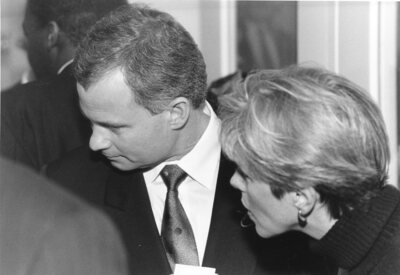 Photograph of former Clark University basketball coaches Wally Halas and Barbara "Bardy" Stevens conversing at the Clark Athletics Hall of Fame induction ceremony, 1994. Halas was inducted that year while Stevens would be inducted in 2006.