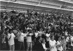 Photograph of cheering fans at a Clark University men's basketball game, circa 1980s.