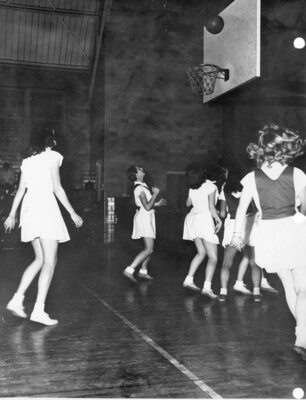 Action photograph of a Clark University women's team basketball game, circa 1940s-1950s.