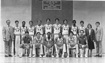 Photograph of the 1978-1979 Clark University men's basketball team, led by Coach Wally Halas. During this season the team became the NCAA Division III Northeast Regional Champions.