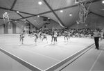 An action photograph of the Clark University men's basketball team during a game, December 1979.