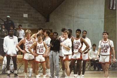 Photograph of the 1986-1987 Clark University JV basketball team looking towards the camera in a semi-candid moment.