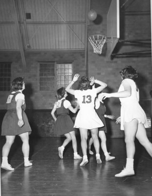 Action photograph of a Clark University women's team basketball game, circa 1940s-1950s.