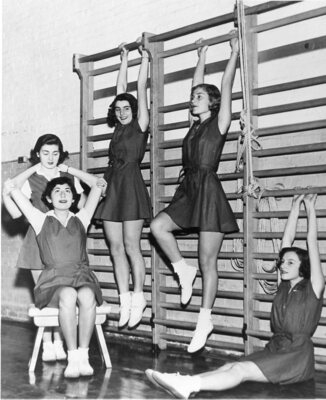 Photograph of Clark University women’s basketball team stretching, circa 1940s-1950s.