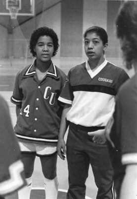Photograph of Captain Judy Hodge and Lynne Howes from the Clark University women's basketball team, 1984.