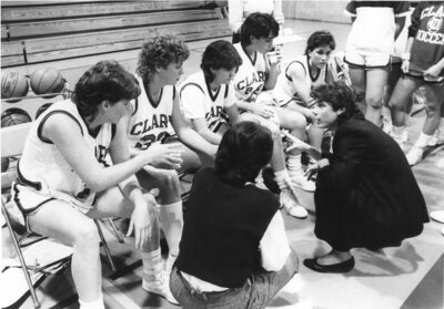 Photograph of coach Pat Glispin and the Clark University women’s basketball team during a huddle, 1987. Glispin has a remarkable legacy of almost four decades as Clark's women's basketball coach.