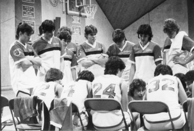 Photograph of coach Pat Glispin and the Clark University women’s basketball team during a huddle. Glispin has a remarkable legacy of almost four decades as Clark's women's basketball coach.