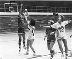 Action photograph of a Clark University women's team basketball game, 1979.