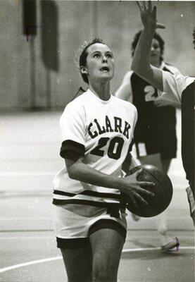 Photograph of a Clark University women’s basketball team member with the ball during a game, 1979.