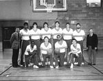 The Clark University men's basketball team group photo led by Coach Wally Halas, circa 1984.