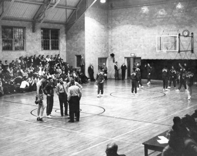 An action photograph of the Clark University men's basketball team during a game, 1953.
