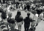 Clark Bars students perform a cappella at a Clark University reunion event, 1992. The backs of the a cappella singers face the camera; the shot looks out at the campus green while alumni and other guests watch the outdoor performance.