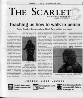 The cover story for this issue is "Teaching us how to walk in peace: Sonia Sanchez lectures about Black arts, politics and power". Other headlines include "Clark's got talent: Critical MASS wins Consortium competition", "Hindsight isn't always 20/20: In Washington, it's deja vu all over again", "Stepping into Escher's world: Impossible Reality at the New Britain Museum of Art", coverage on the East Coast premiere of documentary Ciclovida: Lifecycle by local filmmaker Michael Feinstein, and more. Regular columns include "Clark in Brief", "News of the Weird", "Letters to the Editor", "What You Think", "Hey, baby...What's your major?", "Wild Worcester", and "Marc on the Menu" (local cuisine reviews).