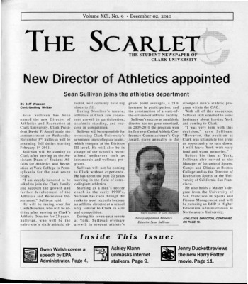 The December 9, 2010 edition of The Scarlet (est. 1939), Clark University's student-run newspaper. The Scarlet is intellectually and editorially independent of the University.