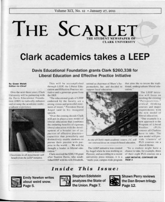 The January 27, 2011 edition of The Scarlet (est. 1939), Clark University's student-run newspaper. The Scarlet is intellectually and editorially independent of the University.