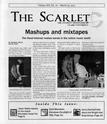 The cover story for this issue is "Mashups and mixtapes: The Hood Internet makes waves in the online music world". Other headlines and coverage include "Clark professors discuss the Middle East", "Clark's Model United Nations Team ranked in top ten", "Clark escort helps local fire victims", "Clark history, 'warts and all'", "Fixing American debt may require sacrifice", reviews of new album releases by Mogwai and Tim Hecker, and more. Regular columns include "Clark in Brief", "News of the Weird", "What You Think", "Hey, baby...What's your major?", "Wild Worcester", "Advice Alley", and more.