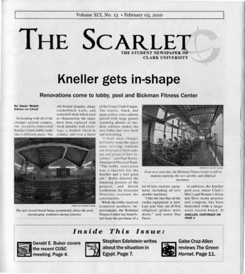The February 3, 2011 (the issue itself has a typo, incorrectly stating the year as 2010) edition of The Scarlet (est. 1939), Clark University's student-run newspaper. The Scarlet is intellectually and editorially independent of the University.