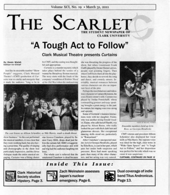 The cover story for this issue is "A tough act to follow: Clark Musical Theatre presents Curtains". Other headlines and coverage include the history of the Beat Generation, Clark's imbalanced curriculum regarding Israel/Palestine, the Fukushima nuclear accident, U.S military intervention in the Middle East, a review of the latest Titus Andronicus album and the film Sucker Punch, and more. Regular columns include "Clark in Brief", "News of the Weird", "What You Think", "Hey, baby...What's your major?", "Wild Worcester", "Advice Alley", and more.