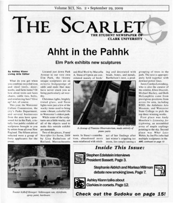 The September 29, 2009 edition of The Scarlet (est. 1939), Clark University's student-run newspaper. The Scarlet is intellectually and editorially independent of the University.