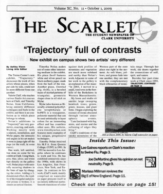The cover story for this issue reports on an on-campus art exhibit called "Trajectory". Other headlines and coverage include author and lawyer Kevin Johnson's visit to Clark, swine flu season, President Obama and Iran, Sony and self-publishing, a GOP attack on net neutrality, The Big E, a review of hypnotist Daniel James's performance at Clark, and more.