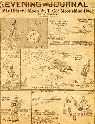 This series presents the editorial cartoons and illustrations that appeared alongside early print coverage of Robert Goddard. The scope is limited to everything within the public domain (up through 1929 at the time of this writing).