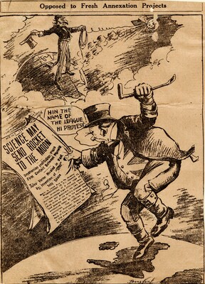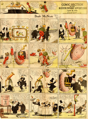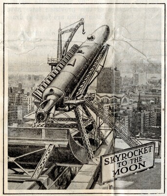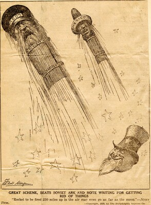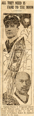 “Modern Jules Verne Invents Rocket to Reach Moon” (Boston American), “Hopes to Reach Moon With a Giant Rocket” (New York Times) and “Savant Invents Rocket Which Will Hit Moon” (San Francisco Examiner), and “Will Giant Rockets be Atlantic Liners of the Future?” (Boston Post) are some typical headlines from January 1920. Illustrations, some of which tied in other current events such as annexation projects, Babe Ruth, Jack Dempsey vs. Georges Carpentier, and the Bolsheviks, accompanied the following days, weeks, and months, and can all be seen in this series. By February of 1920, the Moon became Mars and the rocket was now carrying passengers who hustled their own news cycles by publicly volunteering. A sampling of those headlines include “Prof. Goddard Will Shoot Big Rocket Toward Mars” (Worcester Post), “Proposes Leap to Mars; New York Police Flier Would Do It with Aid of Rocket” (Boston Herald), "First Volunteer For Leap to Mars; Captain Claude Collins of Philadelphia Offers Himself to be Passenger in Rocket” (New York Times).