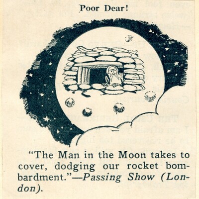 An illustration that appeared in the October 1921 issue of the satirical magazine Judge. The caption reads "The Man in the Moon takes to cover, dodging our rocket bombardment".