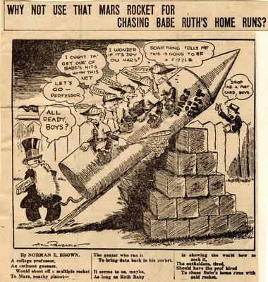 Probesco, Hal and Brown, Norman E., ""Why Not Use That Mars Rocket For Chasing Babe Ruth's Home Runs?", Savannah Morning News" (1920). Goddard in the Press: Editorial Cartoons and Illustrations (1920-1929) [In Progress]. 21.
