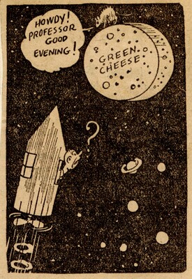 One of three illustrations accompanying the article "Rocket May Pave Way to Moon by Air Route", which appeared in the Boston Traveler on January 7, 1924. It depicts a mouse on top of a moon made of green cheese. The mouse greets the "professor" who is ascending in his rocket. Robert Goddard's fame spread around the world as the 1920s progressed, and the international press fed back into the domestic. The interest in space travel and rocketry had taken on a life of its own, and any opportunity to dedicate print space to it was taken. In early 1924, Goddard received $500 from a new fund that the Smithsonian had access to, on the promise that he "cease generating moonship fantasies" in the press. It didn't make a difference as newspapers looked for any excuse to write about Goddard's rocket to the moon. This story reports on trial flights, the third stage of which purports to send a human to the moon. This, of course, was false.