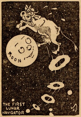 One of three illustrations accompanying the article "Rocket May Pave Way to Moon by Air Route", which appeared in the Boston Traveler on January 7, 1924. It depicts "The First Lunar Navigator", a cow jumping over the moon. Robert Goddard's fame spread around the world as the 1920s progressed, and the international press fed back into the domestic. The interest in space travel and rocketry had taken on a life of its own, and any opportunity to dedicate print space to it was taken. In early 1924, Goddard received $500 from a new fund that the Smithsonian had access to, on the promise that he "cease generating moonship fantasies" in the press. It didn't make a difference as newspapers looked for any excuse to write about Goddard's rocket to the moon. This story reports on trial flights, the third stage of which purports to send a human to the moon. This, of course, was false.