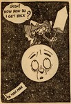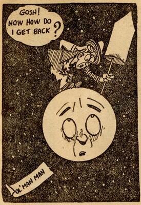One of three illustrations accompanying the article "Rocket May Pave Way to Moon by Air Route", which appeared in the Boston Traveler on January 7, 1924. It depicts a man on top of the moon wondering how he is going to get back. Robert Goddard's fame spread around the world as the 1920s progressed, and the international press fed back into the domestic. The interest in space travel and rocketry had taken on a life of its own, and any opportunity to dedicate print space to it was taken. In early 1924, Goddard received $500 from a new fund that the Smithsonian had access to, on the promise that he "cease generating moonship fantasies" in the press. It didn't make a difference as newspapers looked for any excuse to write about Goddard's rocket to the moon. This story reports on trial flights, the third stage of which purports to send a human to the moon. This, of course, was false.