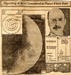 A mix of charts, illustration, and photograph accompanying the article "Signaling of Mars Considered as Planet Whirls Near", printed in a number of United States papers July 24, 1924. The article looks towards August 22 of that year, when Mars was purported to be closer to Earth than it had been in a century. Naturally, Robert Goddard and his "moon rocket" (which was also reported as heading to Mars depending on the press cycle) are incorporated into this reporting.