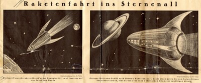 Two illustrations accompanying an article titled "Raketenfahrt ins Sternenall" (approximately translating to "Rocket Trip to Outer Space") for a weekly illustrated magazine called Ost und Süd (East and South). The illustrations are by Max Valier, an significant figure in rocketry. Inspired by Hermann Oberth's Die Rakete zu den Planetenräumen (1923), Valier eventually went onto collaborate on the OPAL-Rek rocket-powered cars and was a founder of Verein für Raumschiffahrt, an important amateur rocket association in Germany that admitted members outside the country. The association was founded by Valier, Johannes Winkler, and Willy Ley after serving as advisors on Fritz Lang's 1929 film Frau im Mond (Woman on the Moon). The illustrations depict a rocket headed towards the Moon and Saturn, respectively. The article, while not translated, centers around both Robert Goddard and Hermann Oberth.