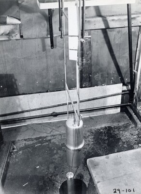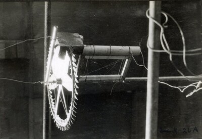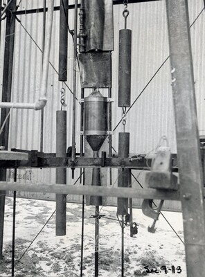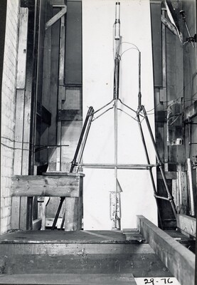 [016] Inside sheet iron shelter at Clark University, first test of liquid propelled rocket lifting its own weight, December 6, 1925